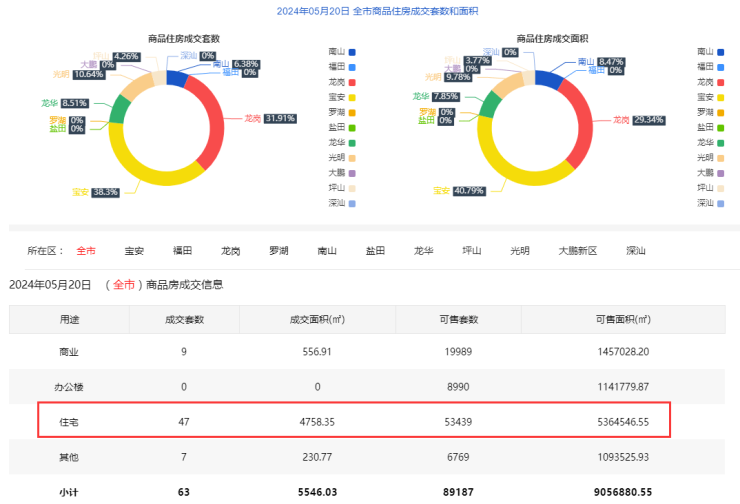2024年5月20日新房住宅共网签47套。宝安18套;福田0套;龙岗 15套;罗湖0套;南山3套;盐田0套;龙华4套;坪山2套;光明5套;大鹏0套;深汕0套。