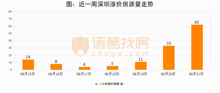 根据诸葛找房数据显示,深圳24小时涨价房源量为62套,较09月20日增加29套,环比上涨87.9%。与此同时,涨价房源占比小幅扩大,业主信心有所提升。