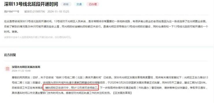 而二期的进度,据官方答复则是:各项工作正在有序推进,铺轨招标正在进行中,预计12月底可进场施工。