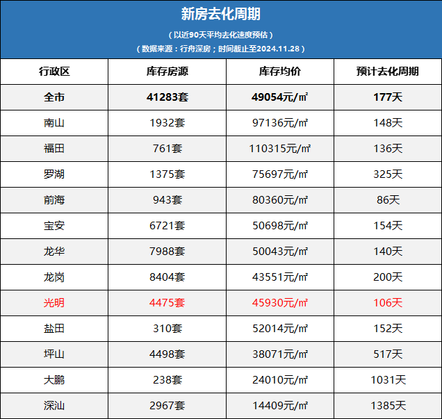 10月楼市回暖,光明楼市快速反应,以13号线沿线为主力的新盘项目去化速度非常明显。据行舟深房数据统计显示,截止11月28日,光明库存新房仅剩4475套,去化周期剩106天,仅次于前海。
