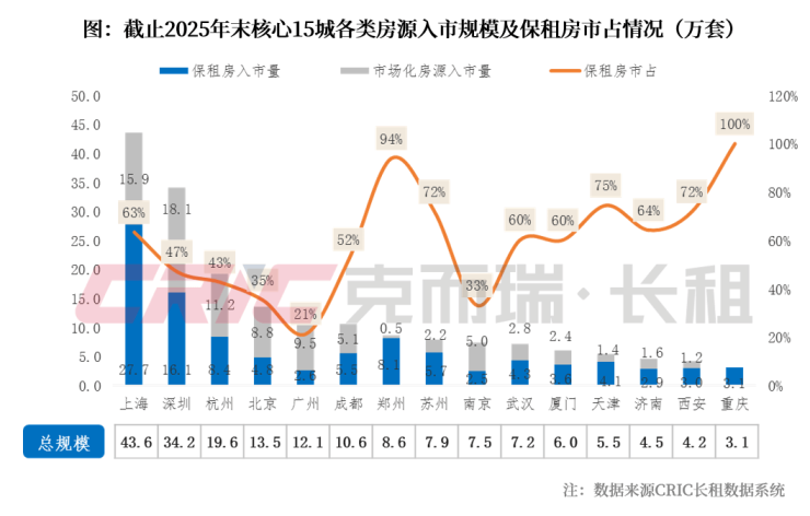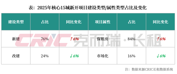 2025年新开持续高位运行,新建项目及保租房主导供给。2025年核心十五城新开集中式公寓规模为19.5万套,同比微降2个百分点;从新开项目建设类型来看,新建类项目占比达76%,同比上涨3%,未来随着租赁土地供给端的持续收窄,行业供应将逐步转向存量改建主导;从新开项目属性表现来看,保租房规模市占84%,同比上涨6%,未来各地将积极进行存量收购类资产的改造与入市工作,城市保租房市占或将持续上涨。