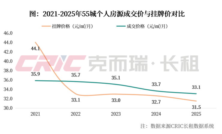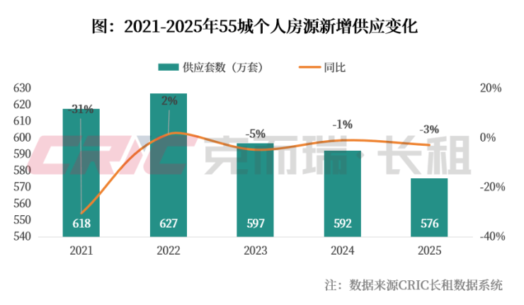 从2021至2025年全国55城个人房源年度供应走势来看,租赁市场与房地产整体周期呈现出紧密关联。