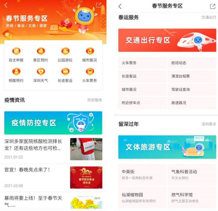 “i深圳”APP已上线“春节服务专区”涵盖疫情资讯、春运服务、留深过年、居家文娱等实用服务板块,让市民舒心过大年。