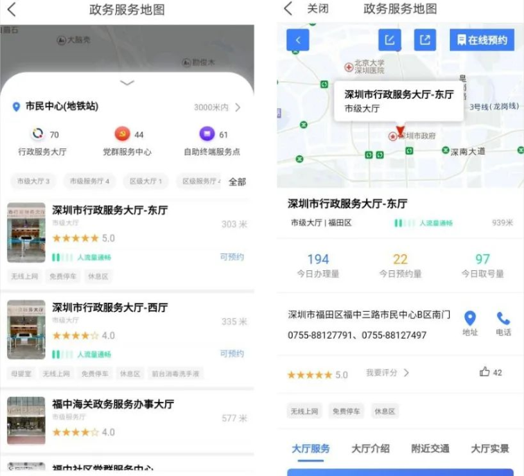 对于需要到线下窗口办理的业务,可以打开“ i 深圳”政务服务地图进行实名预约。“ i 深圳”政务服务地图现已实现将全市各级行政服务大厅、自助终端等政务服务设施在一张地图汇聚展示。