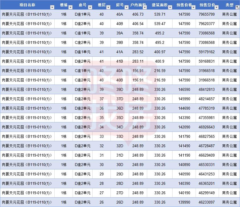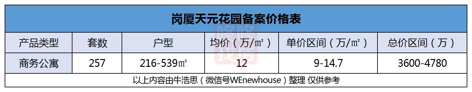 深圳中心天元(备案名:岗厦天元花园)获批预售许可证,并在住建局官网公示,本次备案257套商务公寓、1套单身公寓,共258套房源。