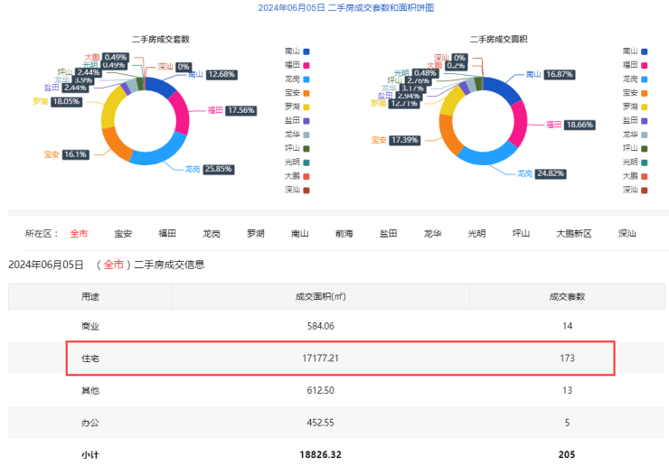 2024年6月5日二手房住宅网签173套。宝安33套;福田29套;龙岗45套;罗湖25套;南山23套;盐田4套;龙华7套;光明1套;坪山5套;大鹏1套。
