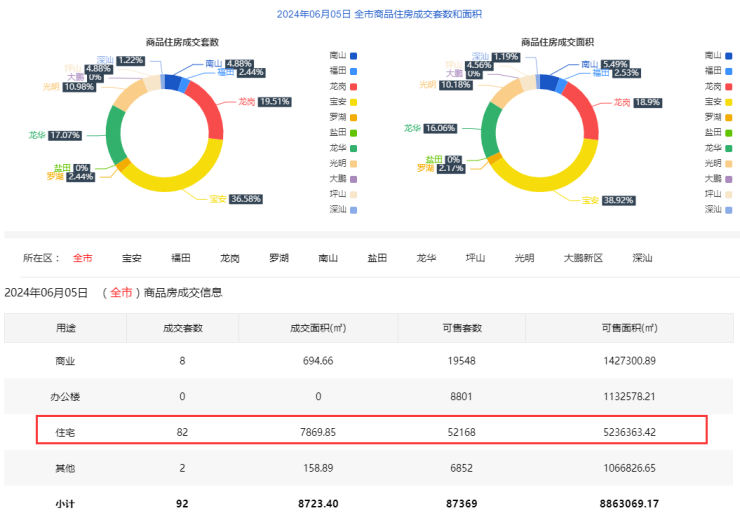 2024年6月5日新房住宅共网签82套。宝安30套;福田2套;龙岗16套;罗湖2套;南山4套;盐田0套;龙华14套;坪山4套;光明9套;大鹏0套;深汕1套。