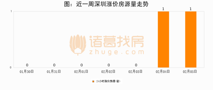 根据诸葛找房数据显示,深圳24小时涨价房源量为1套,较02月04日持平。