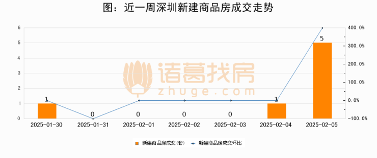 根据深圳市住房和城乡建设局数据显示,2025年02月05日深圳新建商品房成交5套,较昨日增加4套,环比上涨400%