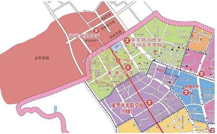 小学部、初中部电脑随机派位学区:由未来小学学区、龙 华区实验学校小学部学区、和平实验小学学区范围组成。包含曼海宁、和平里、港铁天颂、中海锦城、中海汇德理、中央原著、华业玫瑰四季、中航天逸、莱蒙水榭春天(部分)等等小区。