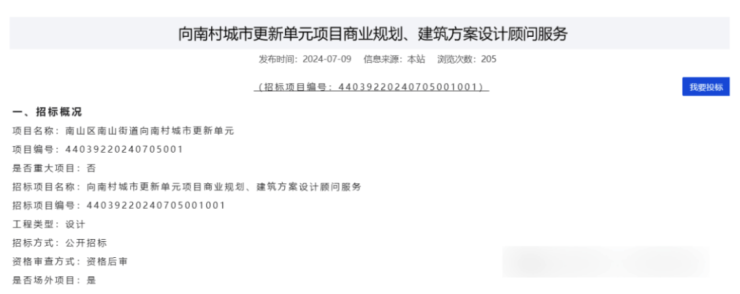 8月12日,向南村更新项目商业规划、建筑方案设计顾问服务资审及业绩公示。