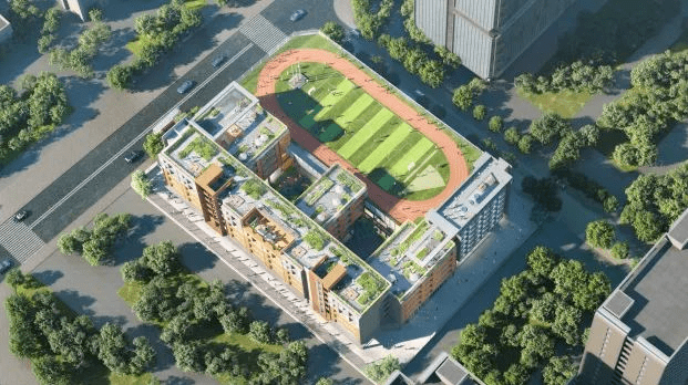值得一提的是,尚美小学通过集约化布局打造简约自然的校园环境,让学生可以在绿树、草地围绕的庭院空间自由乐学、亲近自然。校园通过打造由大树、草地围绕的庭院空间,促进学生之间交流和自由成长,给予孩子们多方位、多元化的空间体验,在自然中培养孩子的感知力。同时,学校高标准配备配备体育馆、图书馆、艺术长廊、剧场、教师宿舍及音乐、美术、科学、信息技术等功能室,楼顶将建设成为种植区。