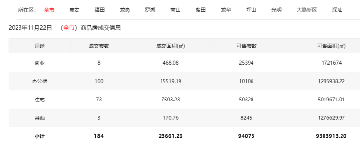 11月22日深圳新房住宅成交73套 二手房住宅成交159套