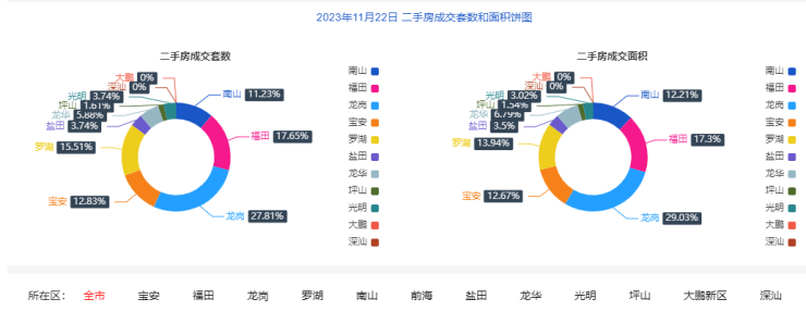 11月22日二手房住宅网签159套。宝安23套;福田27套;龙岗43套;罗湖27套;南山17套;盐田6套;龙华9套;光明5套;坪山2套;大鹏0套。