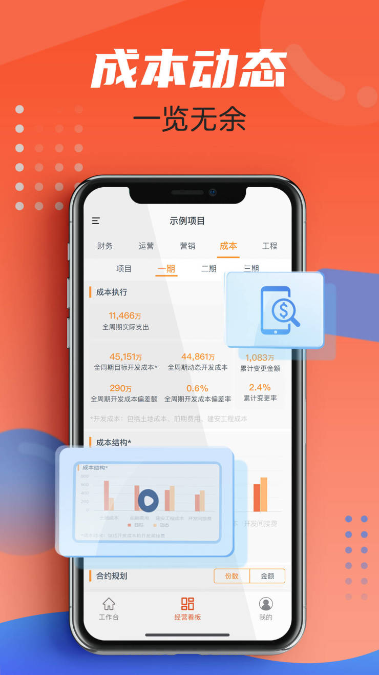 指标覆盖全周期利润动态、现金流动态、认签回动态、营销费发生、合约规划执行、目标与动态成本、签证变更、节点达成、工地视频等方面内容。