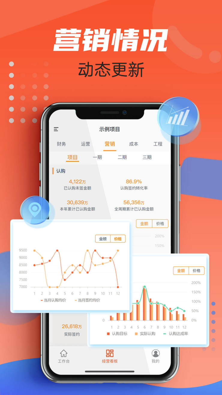 金地管理通过精细化的营销费用管控体系,帮助项目采取最佳策略,合理控制费用,达成销售目标。针对项目实施了“月度/季度/年度”的动态考核机制,实现营销数据每日刷新、营销费用发生及费率情况时时可见。同时,营销费用管控体系对认购、签约、回款及库存去化多维度进行趋势分析,助力销售策略即时调整。