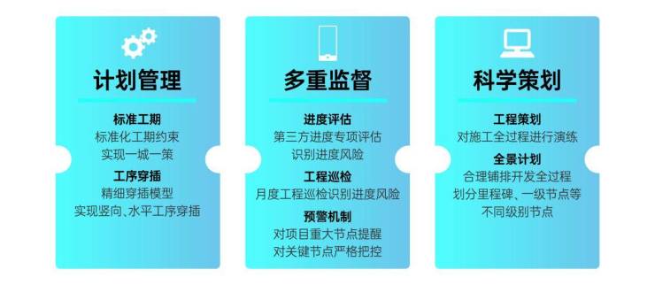 结合完备的进度管理体系与质量保障体系,金地管理实行了多级计划管理并推行标准工期和穿插施工,在过程实施中定期对计划分析纠偏。通过将全景开发计划动态呈现,对异常进度节点即时预警,工地现场实时视频监控,实现项目开发节奏全盘把控。