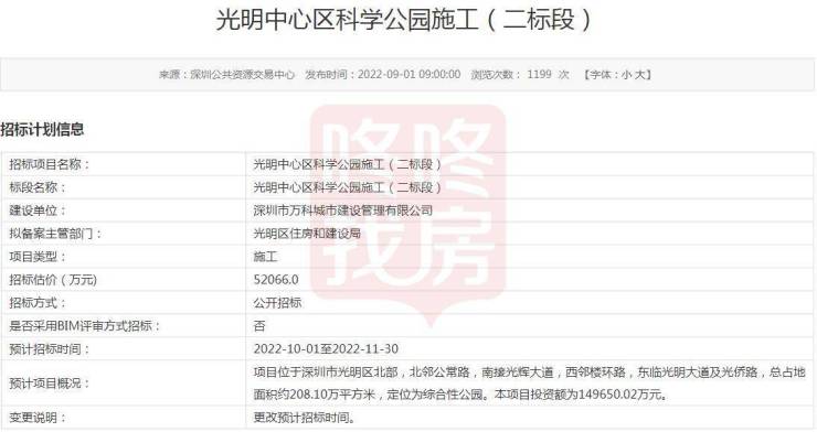9月1日,深圳公共资源交易中心发布《光明中心区科学公园施工(二标段)》招标。