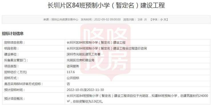 长圳片区84班预制小学(暂定名)建设工程项目位于光明区,拟建84班预制小学,总建筑面积约24000㎡,总投资暂估为2.0亿元。