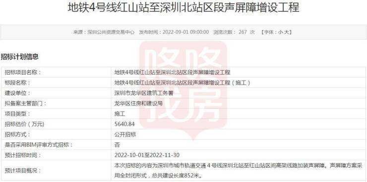 另外,4号线深圳北站-红山站周边的小区有好消息,要加设全封闭式声屏障了!9月1日,深圳公共资源交易中心发布《地铁4号线红山站至深圳北站区段声屏障增设工程》。