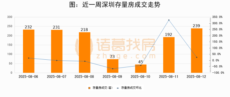 从存量房来看,2025年08月12日深圳存量房单日成交239套,比昨日增加47套,环比上涨24.5%。从近一周存量房成交来看,深圳存量房日均成交套数为175套,08月12日单日成交239套,高于近一周平均水平36.6%。