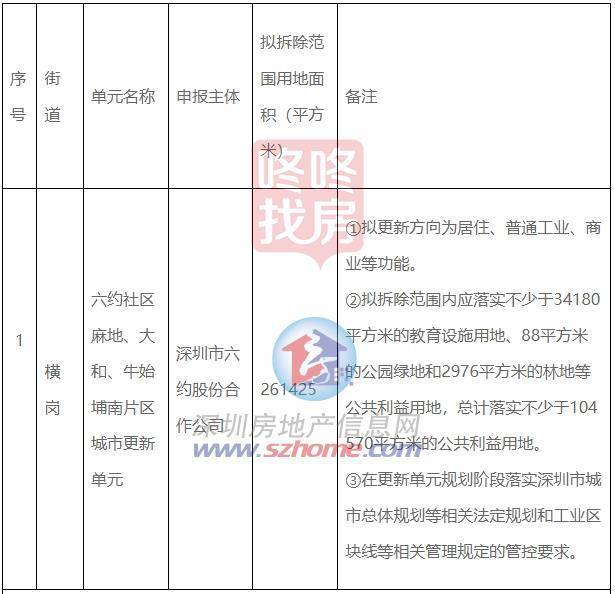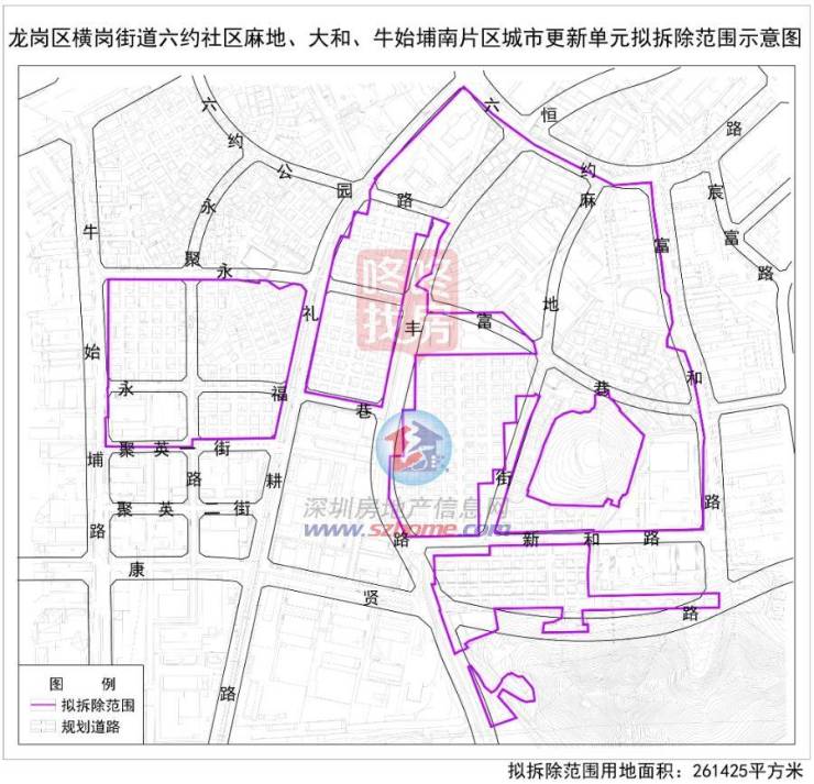 六约社区麻地、大和、牛始埔南片区城市更新单元位于龙岗区横岗街道,申报主体为深圳市六约股份合作公司,拟拆除范围用地面积261425平方米。