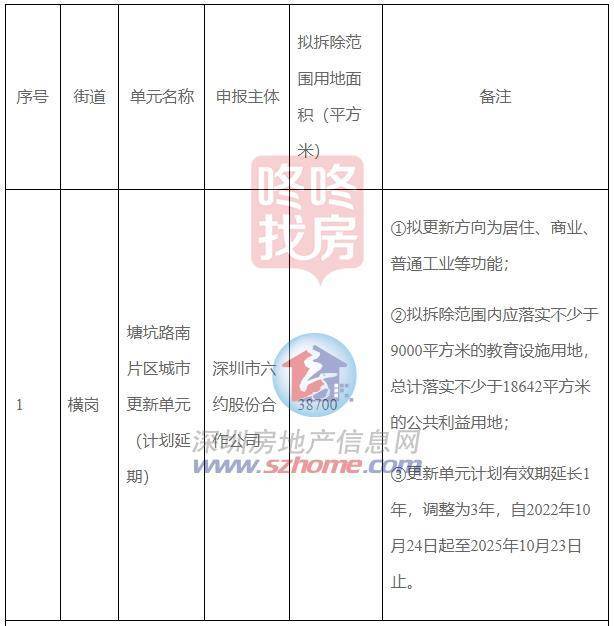 另一个是塘坑路南片区城市更新单元,有效期延长1年,自2022年10月24日起至2025年10月23日止。拟更新方向为居住、商业、普通工业等功能。