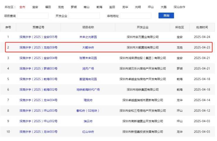 4月23日,位于龙岗布吉的大靓华府获批预售,首推2栋1单元,共168套房源;