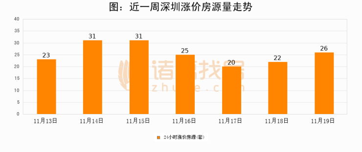 根据诸葛找房数据显示,深圳24小时涨价房源量为26套,较11月18日增加4套,环比上涨18.2%。与此同时,涨价房源占比小幅扩大,业主信心有所提升。