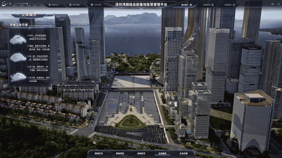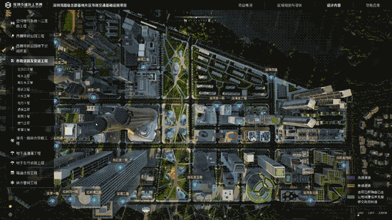 项目依托CIM平台,全景式展现深超总片区的智慧设施、生态设计、绿化景观、人性化设施、艺术装置及配套服务,实现片区市政设计的可视化、交互化和数据化管理,有效提升了使用体验与片区管理效率。