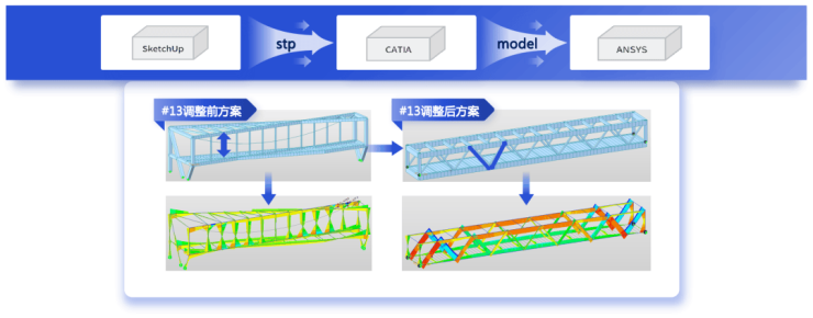 二层连廊完成概念设计后,即进行节点与杆件处理,最后开展有限元受力分析。例如,#13号连廊原65米跨桁架方案经核算不满足受力要求,优化为斜腹杆桁架结构后,成功满足规范要求,为连廊加装了更稳固的“承重骨架”。