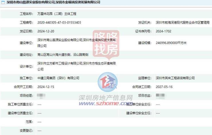近日,位于前海的万星林花园(二期)主体工程批准施工许可。合同开工日期2024年12月15日,合同竣工日期2027年5月16日。