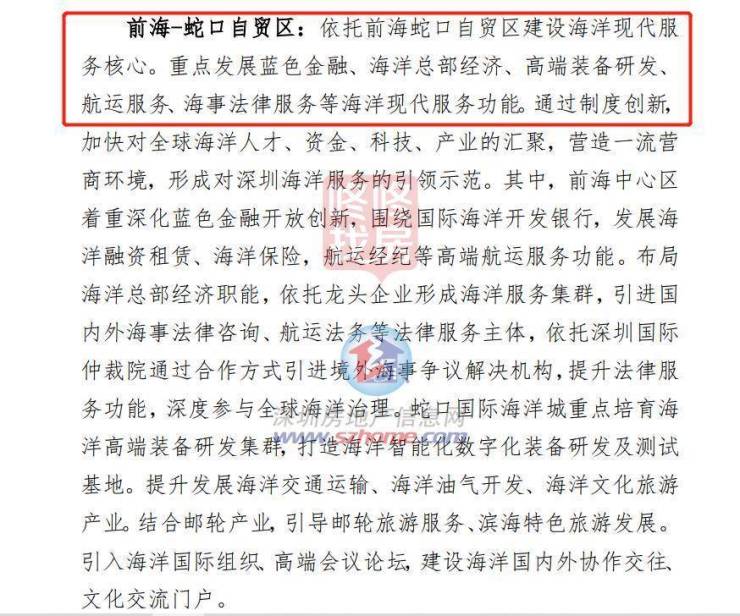 前海-蛇口自贸区:依托前海蛇口自贸区建设海洋现代服 务核心。重点发展蓝色金融、海洋总部经济、高端装备研发、 航运服务、海事法律服务等海洋现代服务功能。