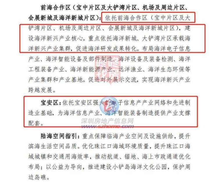 前海合作区(宝中片区及大铲湾片区、机场及周边片区、 会展新城及海洋新城片区):依托前海合作区(宝中片区及大 铲湾片区、机场及周边片区、会展新城及海洋新城片区),建 设海洋新兴产业核心。重点依托海洋新城、大铲湾片区承载海 洋新兴产业集群,促进海洋研发成果转化。