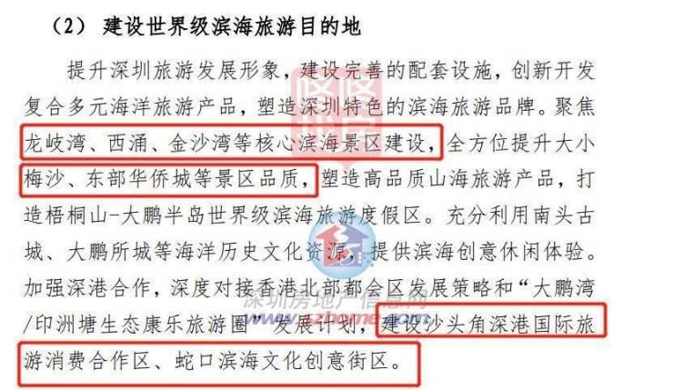 包括大鹏新区、盐田区,依托大亚湾、大鹏湾沿岸陆海空间,重点布局海洋基础科研及高等教育设施,打造高级枢纽港及滨海旅游度假区,促进航运服务、海洋生物产业、滨海休 闲旅游等特色产业高质量发展。