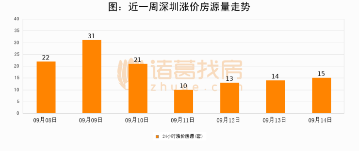 根据诸葛找房数据显示,深圳24小时涨价房源量为15套,较09月13日增加1套,环比上涨7.1%。与此同时,涨价房源占比小幅扩大,业主信心有所提升。