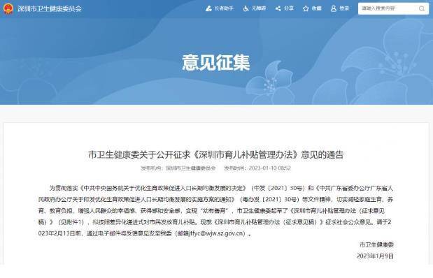 1月10日,深圳市卫生健康委公开征求《深圳市育儿补贴管理办法》意见。