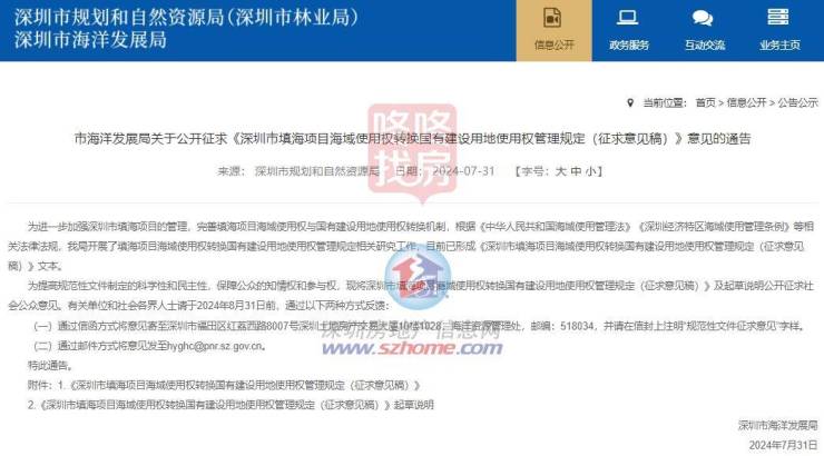 近日,深圳市海洋发展局发布《深圳市填海项目海域使用权转换国有建设用地使用权管理规定(征求意见稿)》(以下简称规定),公开征求意见。