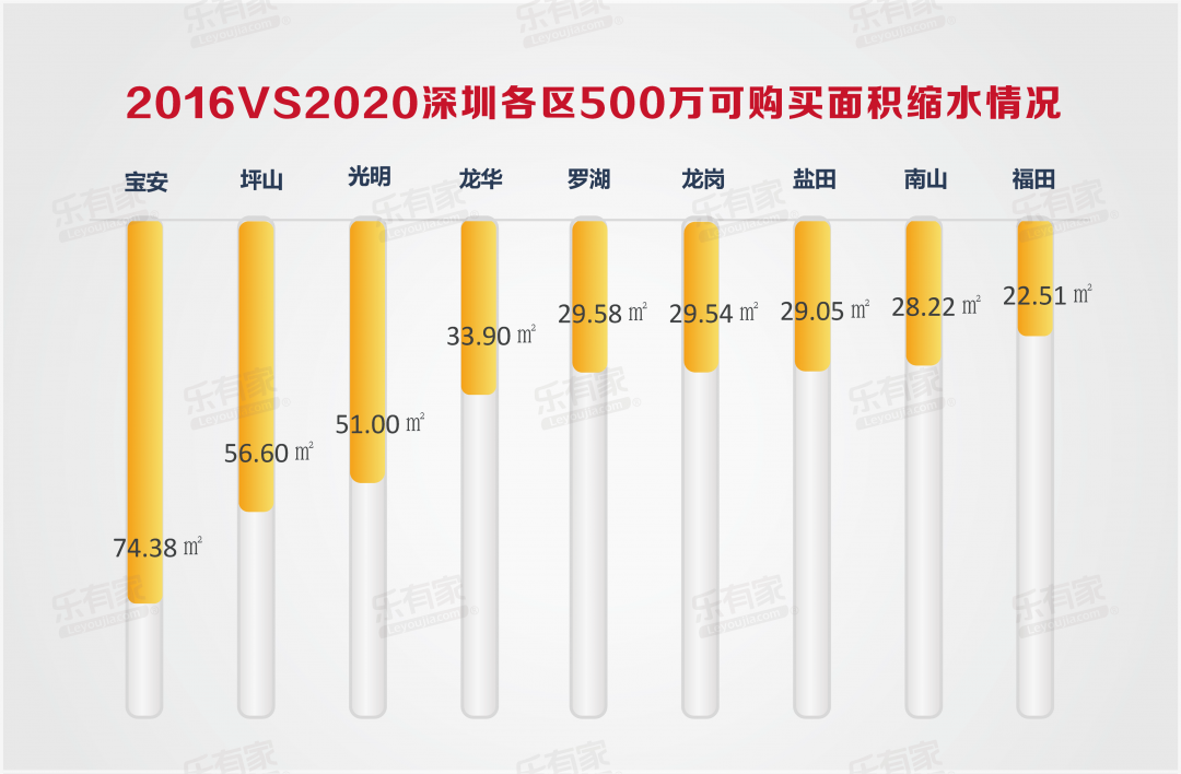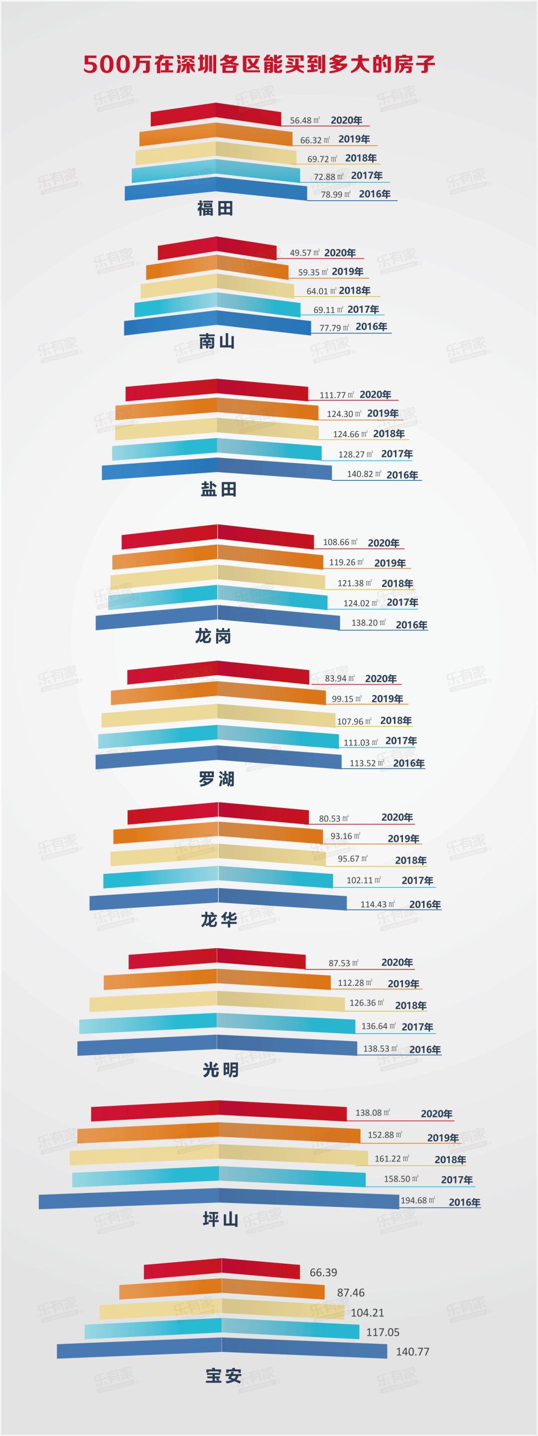 2020年500万可在宝安购买到的二手住宅,相较2016年可购买的同类住宅面积减少了74.38㎡。5年时间,相当于少了一套两房甚至三房的面积。