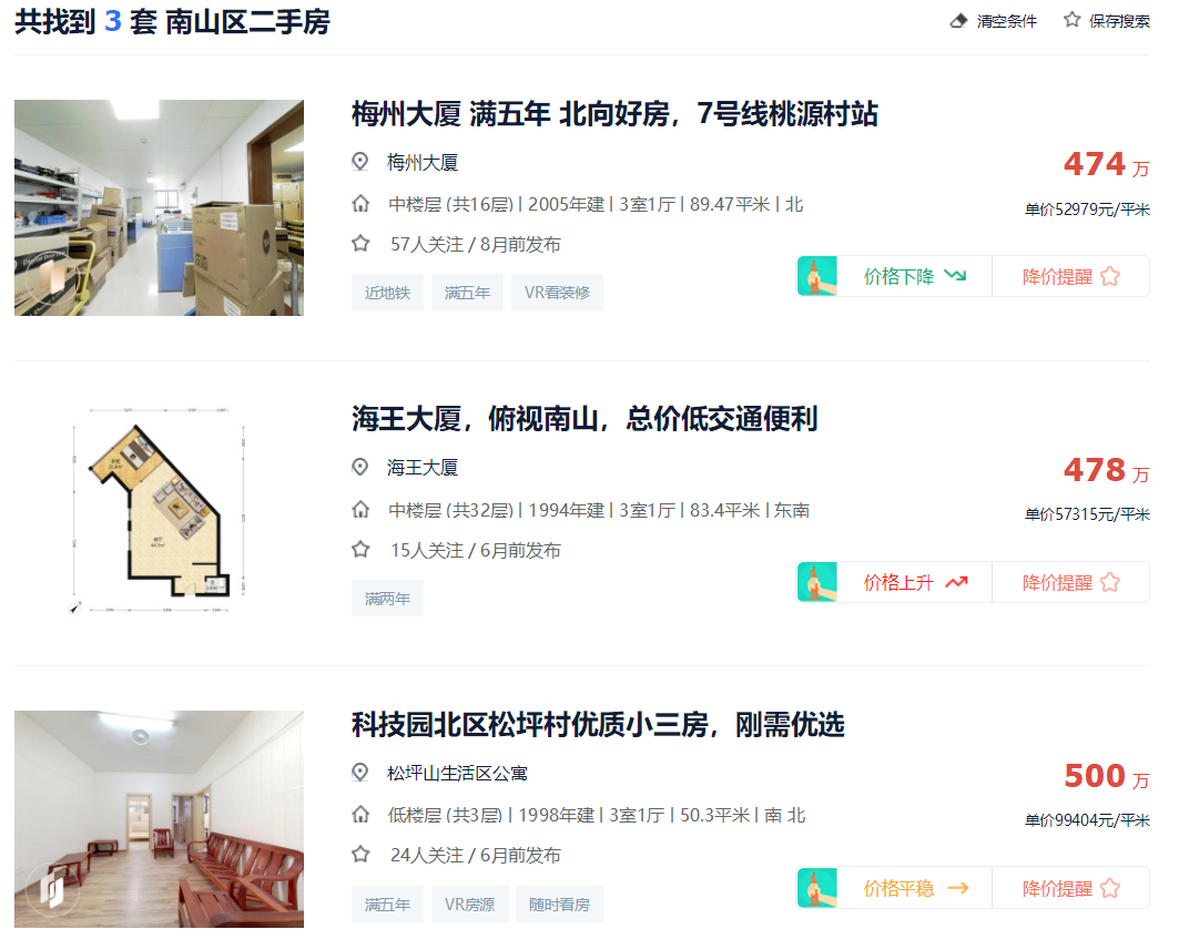 贝壳找房平台显示,福田只有9套房源挂牌,南山更少,只有3套。