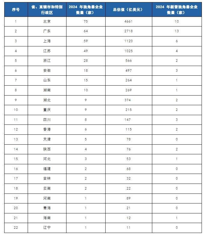 2024年有15个省、直辖市、特别行政区出现新晋独角兽企业,其中广东、北京、上海等地区成为新晋独角兽企业的聚集地,分别达到13家、10家、6家。