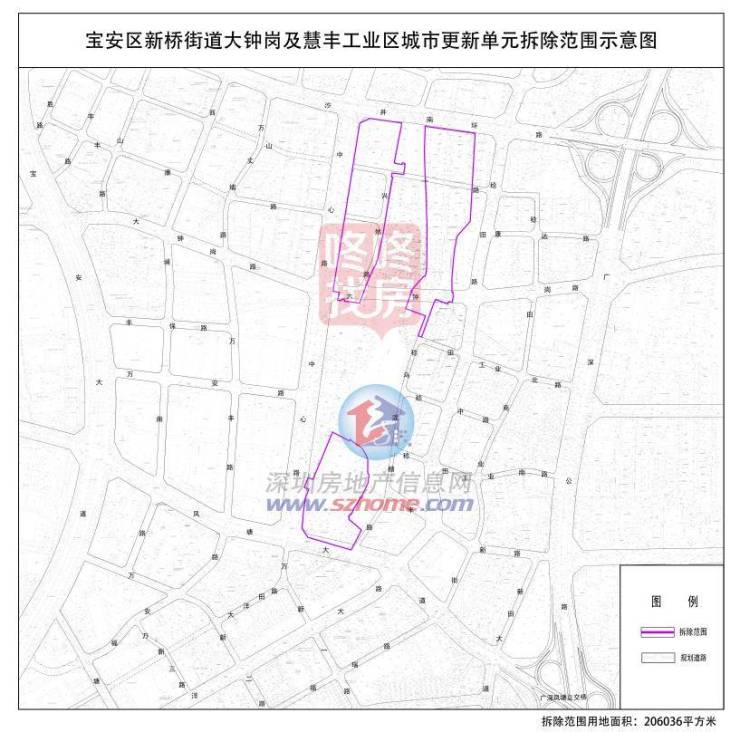 宝安区新桥街道大钟岗及慧丰工业区城市更新单元位于新桥街道,北侧紧邻南环路,西侧为中心路,南侧为凤塘大道,拟拆除范围用地面积为206036㎡。