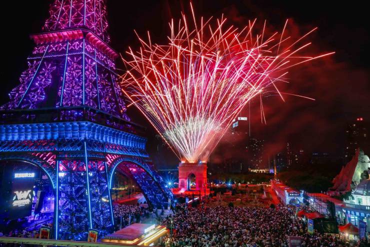 夜幕降临后,铁塔下一键开启狂欢模式,百万舞台为春节造势,百老汇风格融合现代科技元素为电音狂欢现场带来前所未有的新鲜感,特色彩狮、新春福气NPC空降舞台,夜晚激情在此点燃。五彩斑斓的灯光在舞池中闪烁,跳动的音符冲破铁塔,跟随DJ和MC的音乐浪潮,尽情摇摆,尽情享受音乐带来的欢乐。夜晚的狂欢少不了浪漫烟花,年初一到初八,连续八天《烟花之舞》点亮大湾区夜空,打造都市夜游新体验。