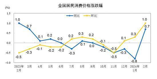 国家统计局数据显示,2024年2月,全国CPI环比上涨1.0%,同比上涨0.7%,为2023年9月以来,首次同、环比双增长。