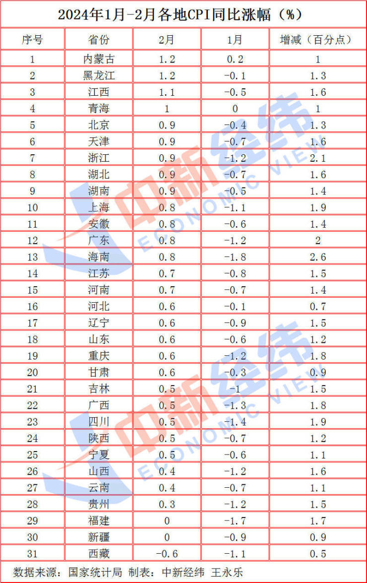 中新经纬3月14日电 (王永乐)日前,国家统计局公布了31省份2024年2月居民消费价格指数(CPI)。中新经纬梳理发现,2月,28省份CPI同比上涨。其中,内蒙古、黑龙江、江西等3省份涨幅超1%。