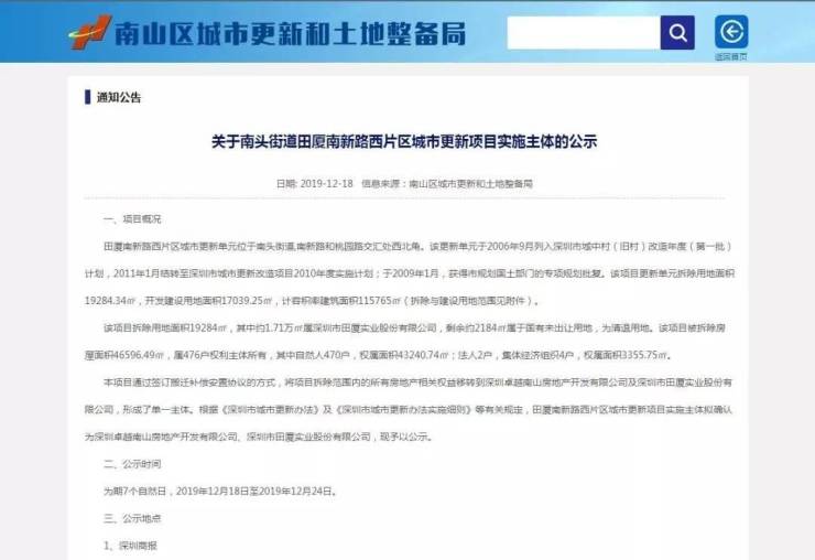 直到2019年12月18日,南山区城市更新和土地整备局发布了关于南头街道田厦南新路西片区城市更新项目实施主体的公示。这也意味着时隔多年,“卓越九珑”项目的建设终于要迎来提速。