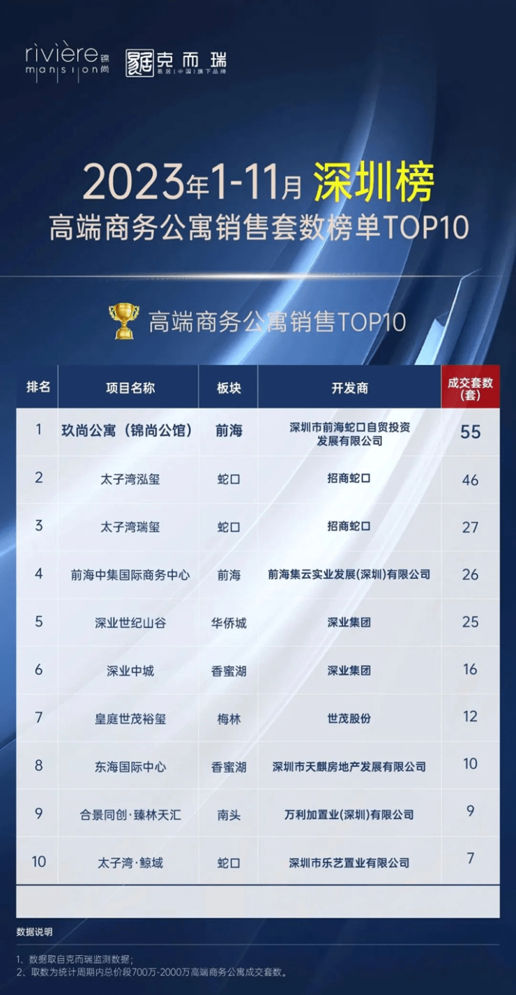 项目自入市以来,虽适逢公寓市场持续下行,但依托妈湾的独特区位优势、国际配套持续落地以及自贸投资别具匠心的品质,获得全国各地客户的青睐和认可,销量逆势而上。2023年,锦尚公馆共成交55套,均价约8.5万/㎡,最终以整盘均价9.2万/㎡的战绩完美收官,总销售额约17亿。据克而瑞数据统计分析,锦尚公馆在同价位项目销量中稳坐榜首。