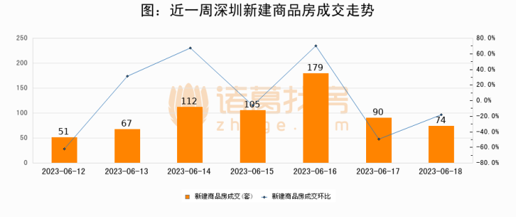 根据深圳市住房和城乡建设局数据显示,2023年06月18日深圳新建商品房成交74套,较昨日减少16套,环比下降17.8%。近一周深圳新建商品房日均成交97套。06月18日单日成交74套,低于近一周平均水平23.7%。