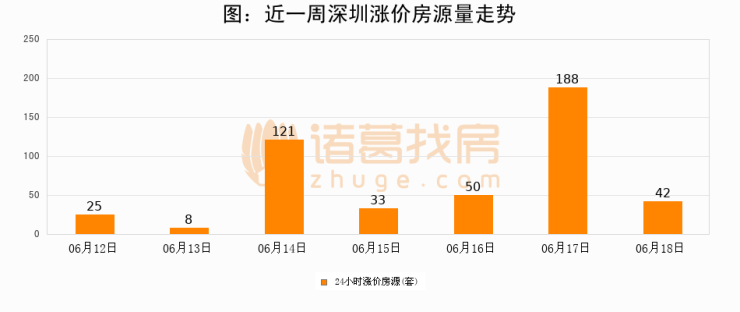 根据诸葛找房数据显示,深圳24小时涨价房源量为42套,较06月17日减少146套,环比下降77.7%。与此同时,涨价房源占比小幅回落,对于购房者来说是一个入市窗口期,购房者可抓住时机入市。