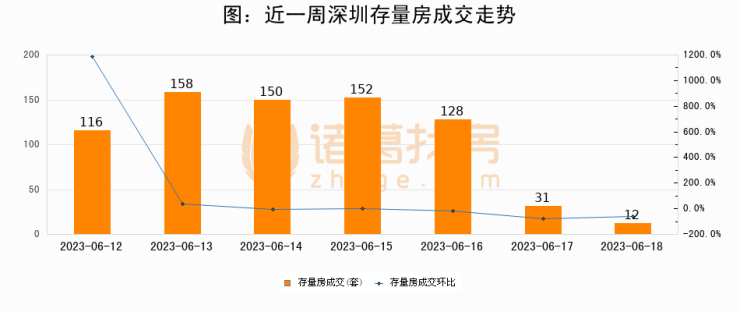 从存量房来看,2023年06月18日深圳存量房单日成交12套,比昨日减少19套,环比下降61.3%。从近一周存量房成交来看,深圳存量房日均成交套数为106套,06月18日单日成交12套,低于近一周平均水平88.7%。